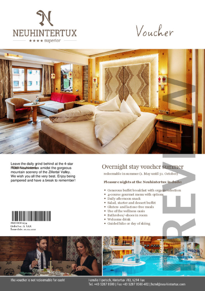 Leave the daily grind behind at the 4-star Hotel Neuhintertux amidst the gorgeous mountain scenery of the Zillertal Valley.<br>We wish you all the very best. Enjoy being pampered and have a break to remember!